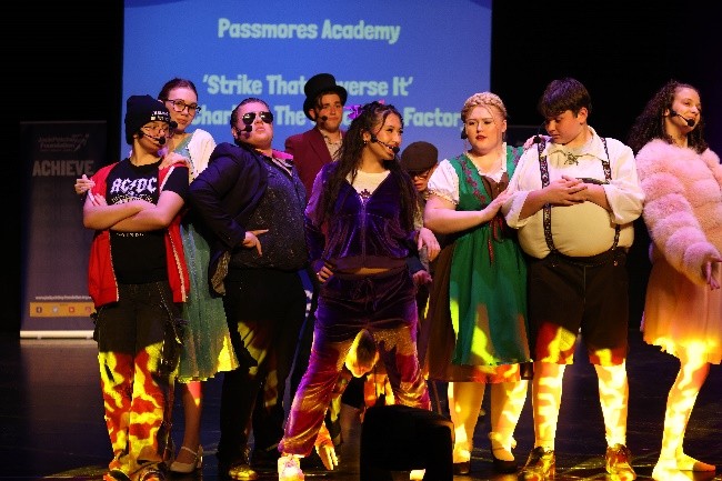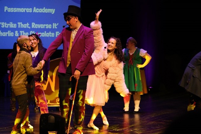 As part of the celebration event, the Passmores school production team gave a sneak preview of Charlie & The Chocolate Factory.